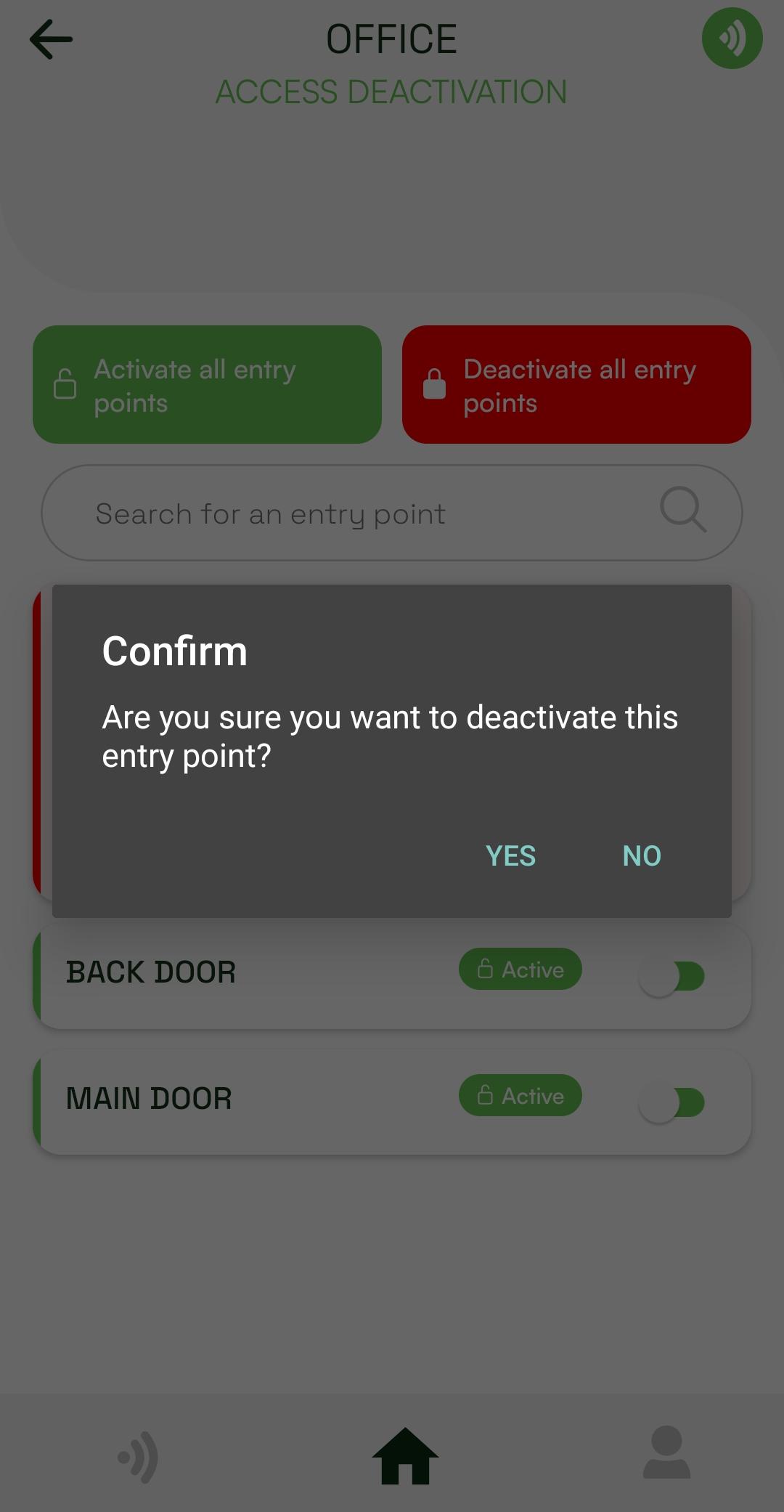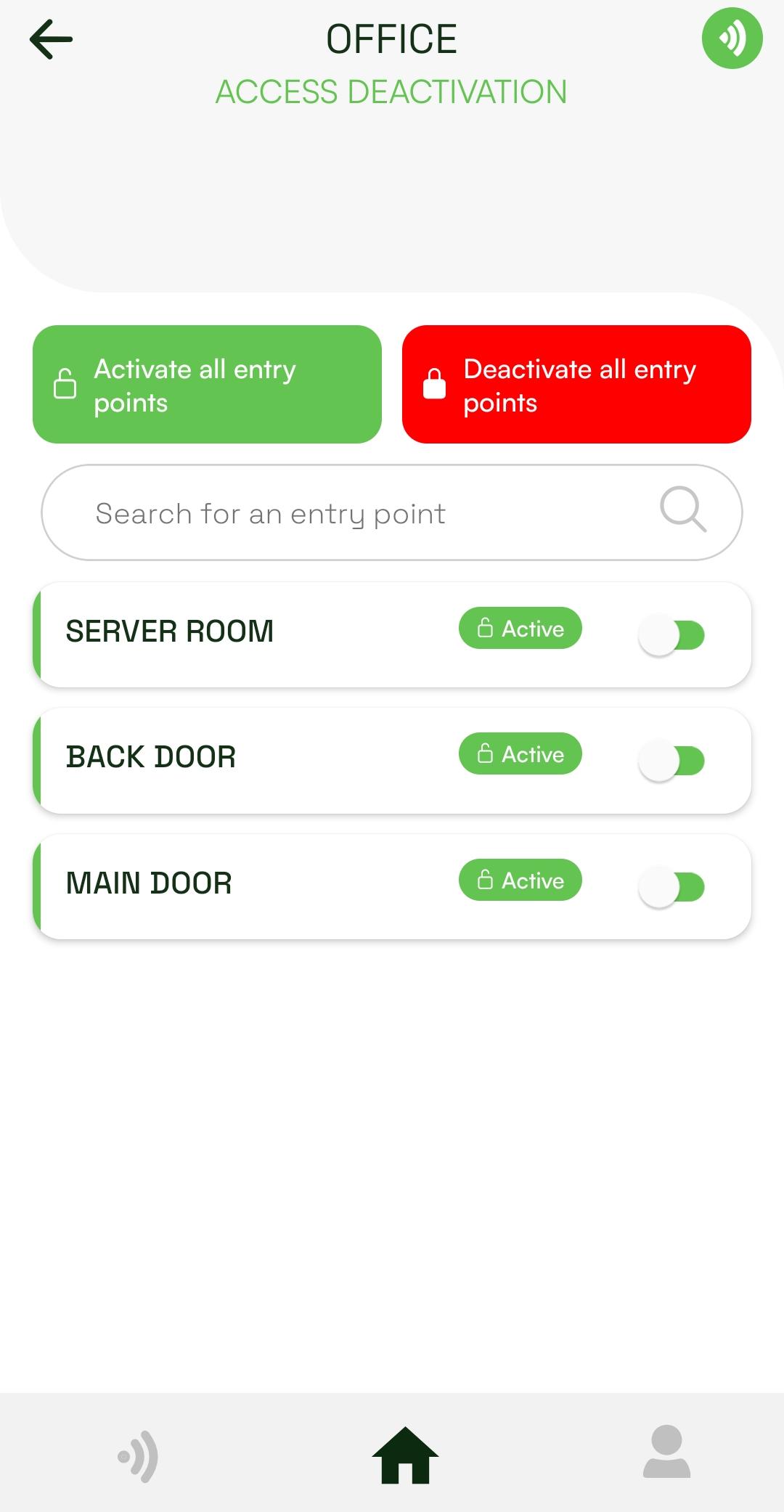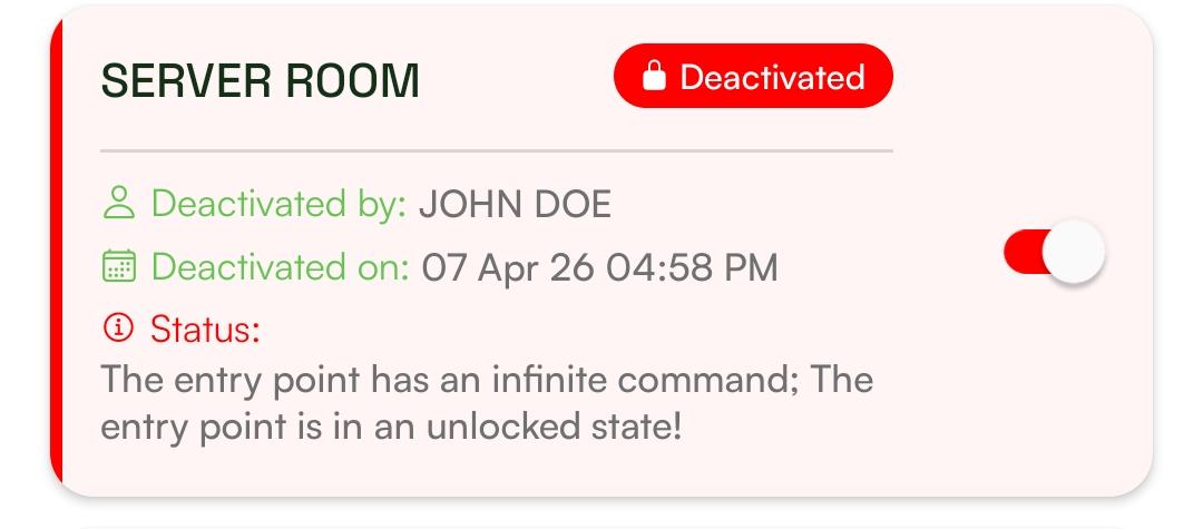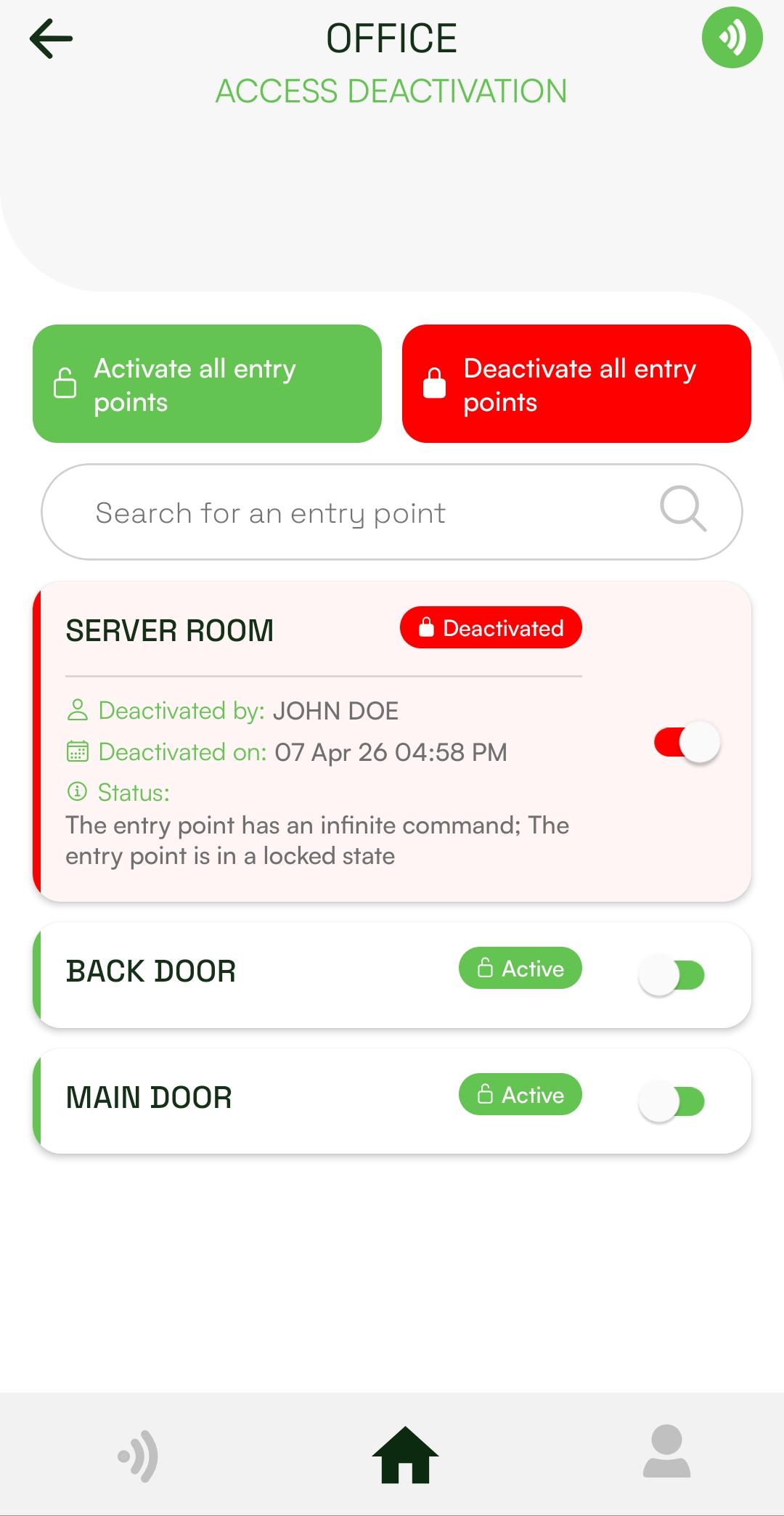 The Access Deactivation screen lets administrators and managers control physical access to a site by deactivating or activating individual or all entry points in real time. This is useful during emergencies, security incidents, or planned maintenance.